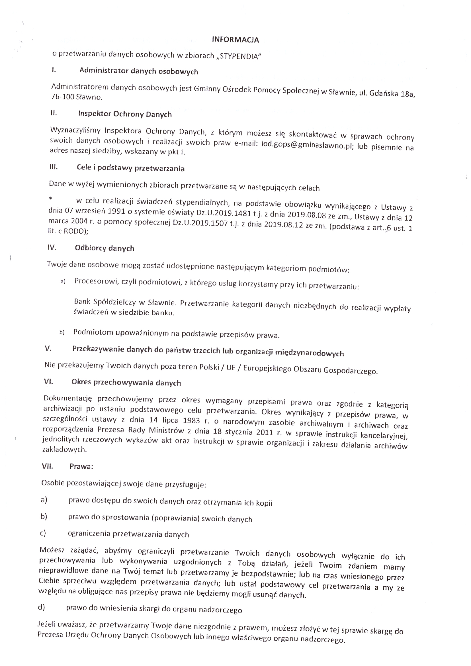 1. Wnioski o stypendium szkolne składa się w Gminnym Ośrodku Pomocy Społecznej w Sławnie w terminie od 1 września do dnia 15 września danego roku szkolnego.