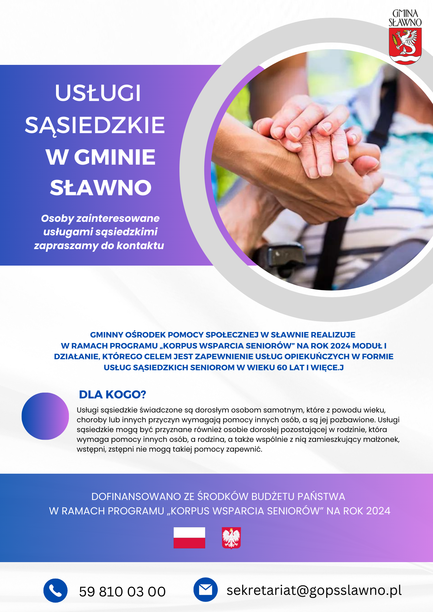 W 2024 roku Gminny Ośrodek Pomocy Społecznej w Sławnie realizuje w ramach Program „Korpus Wsparcia Seniorów” na rok 2024 Moduł I działanie, którego celem jest zapewnienie usług opiekuńczych w formie usług sąsiedzkich seniorom w wieku 60 lat i więcej.